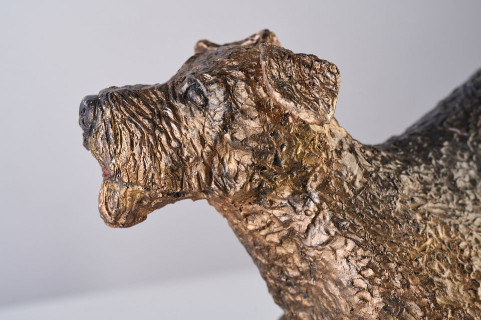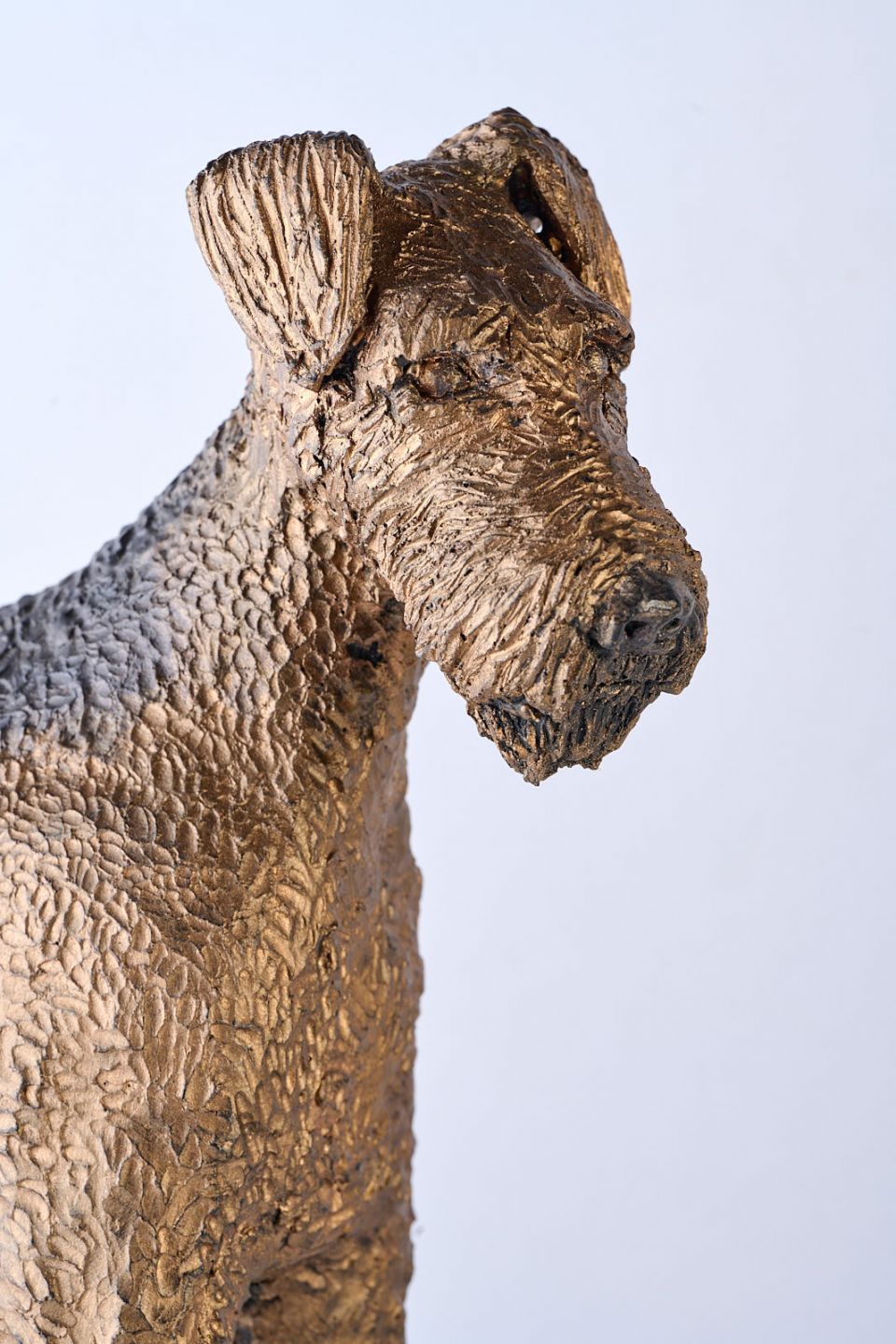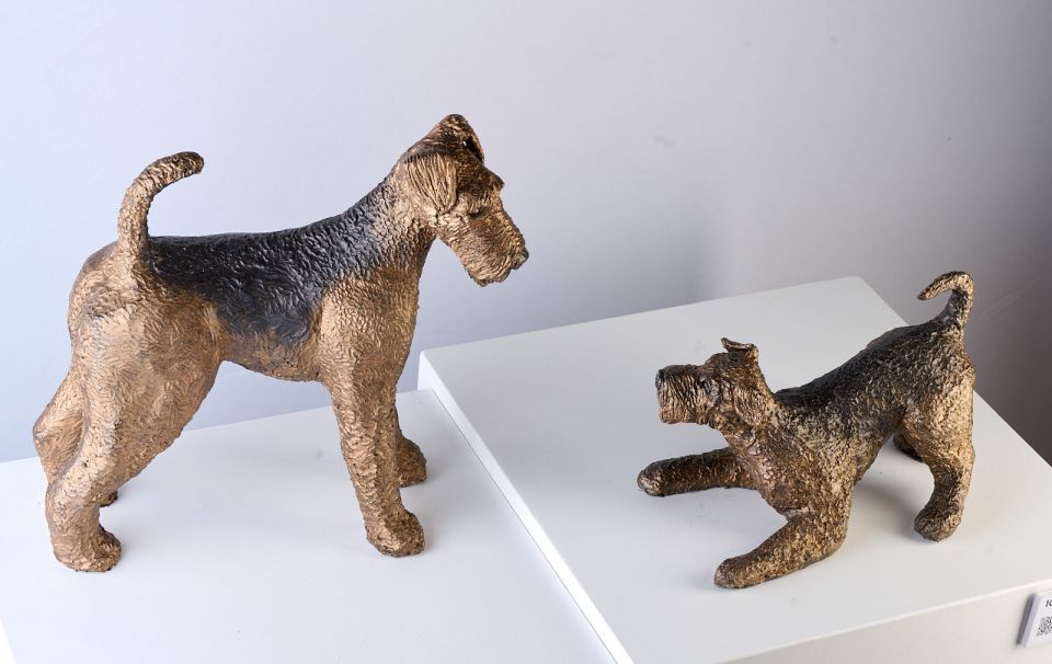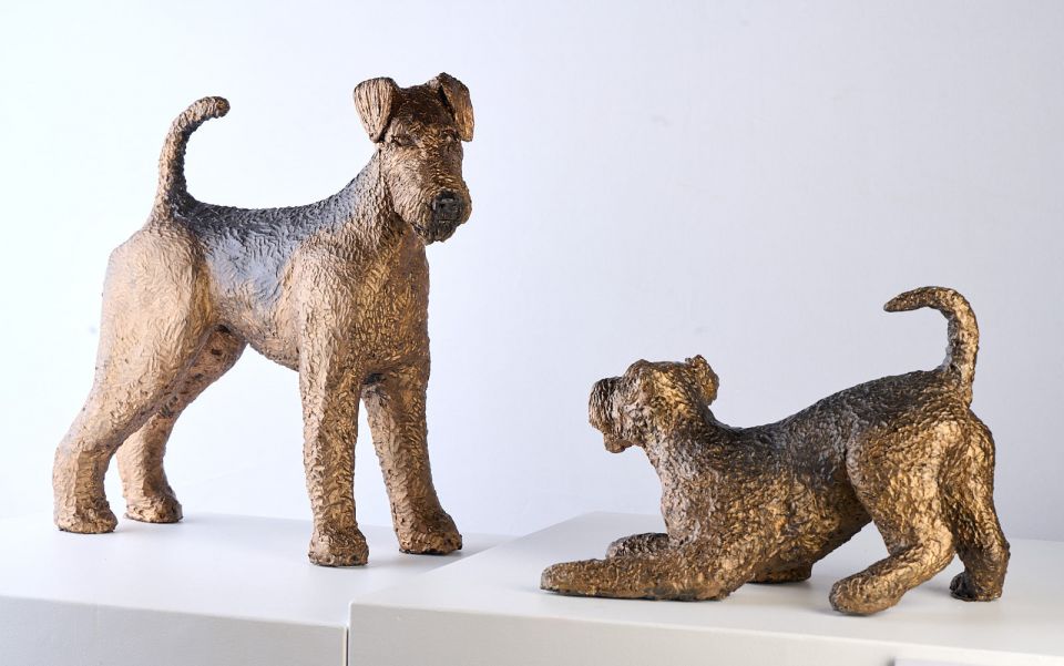 Two airedale terriers, one in show posture, one playfully free, reflects the tension between societal expectations and authentic joy. While the world expects perfection, happiness often comes in unguarded moments.