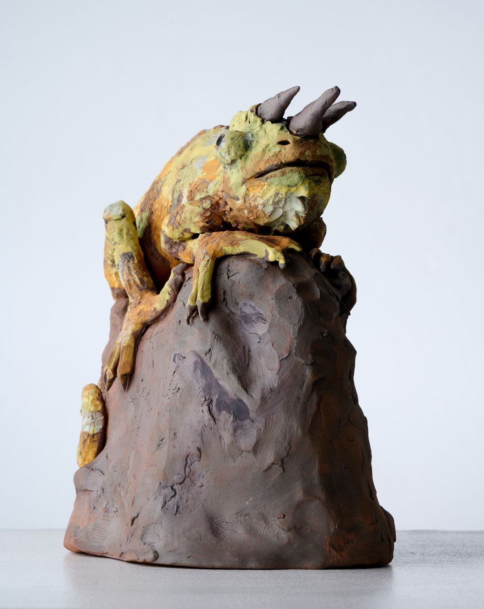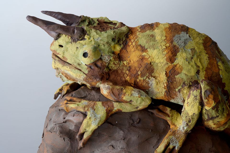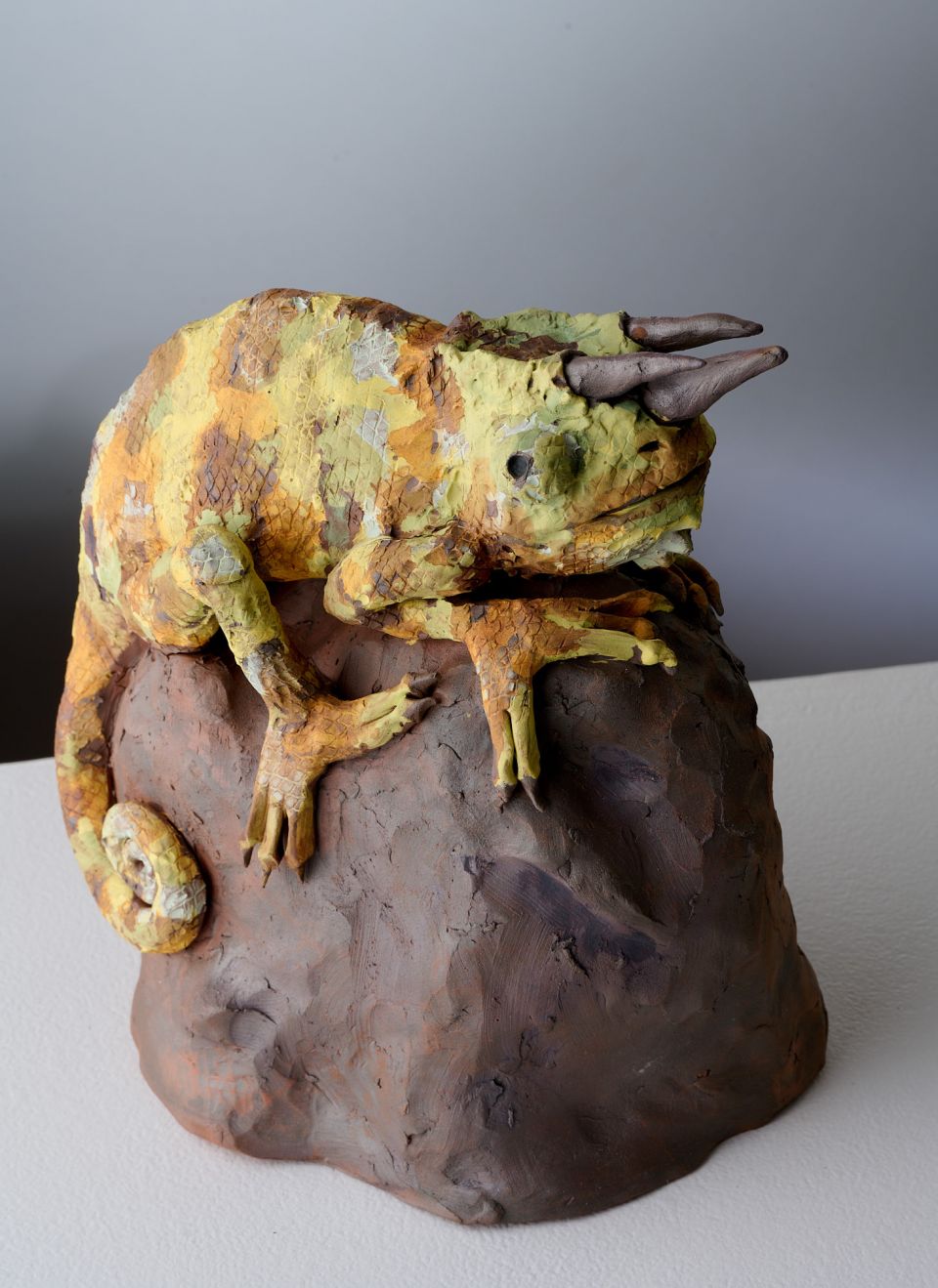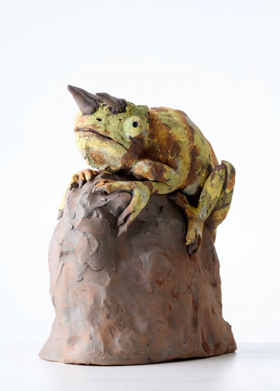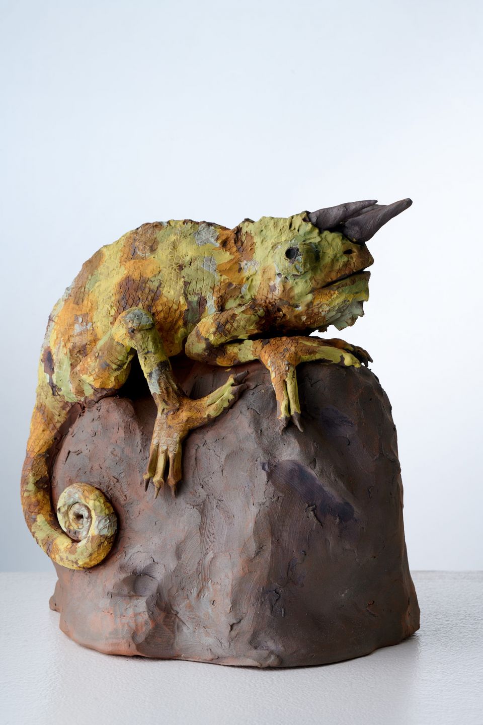 I find the colour range in chameleons fascinating. This one is made from terracotta clay and coloured with underglaze and oxides. It can go either outside or inside.