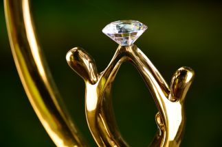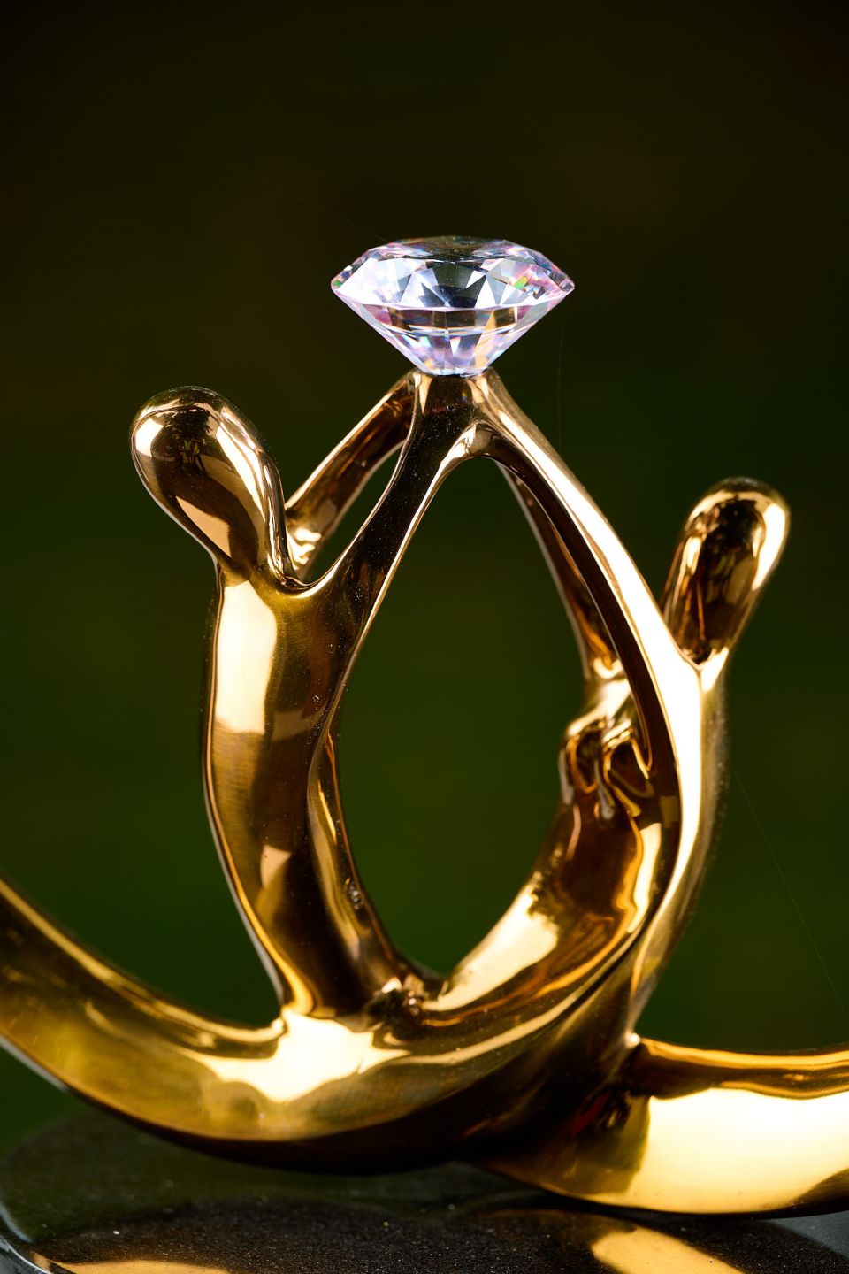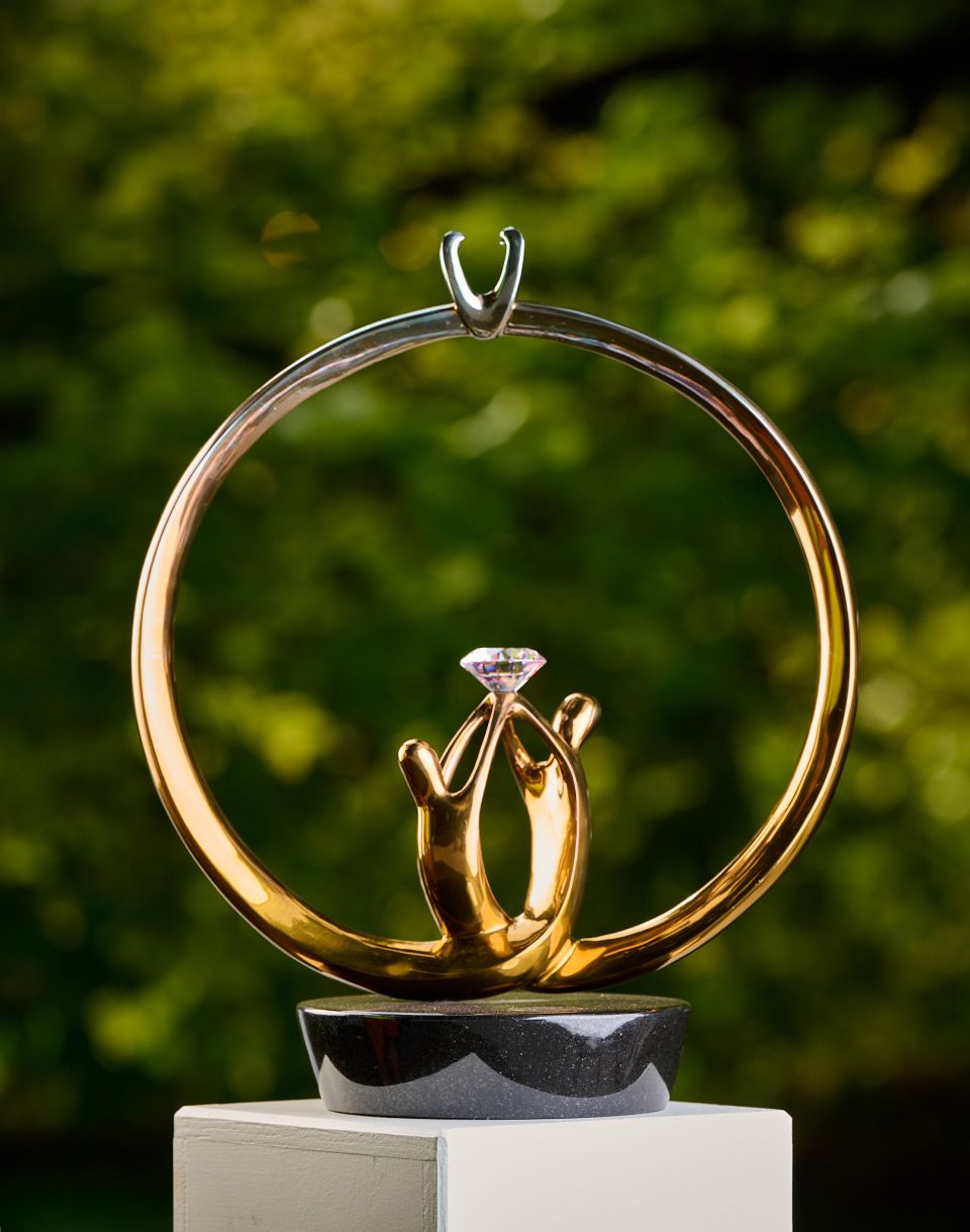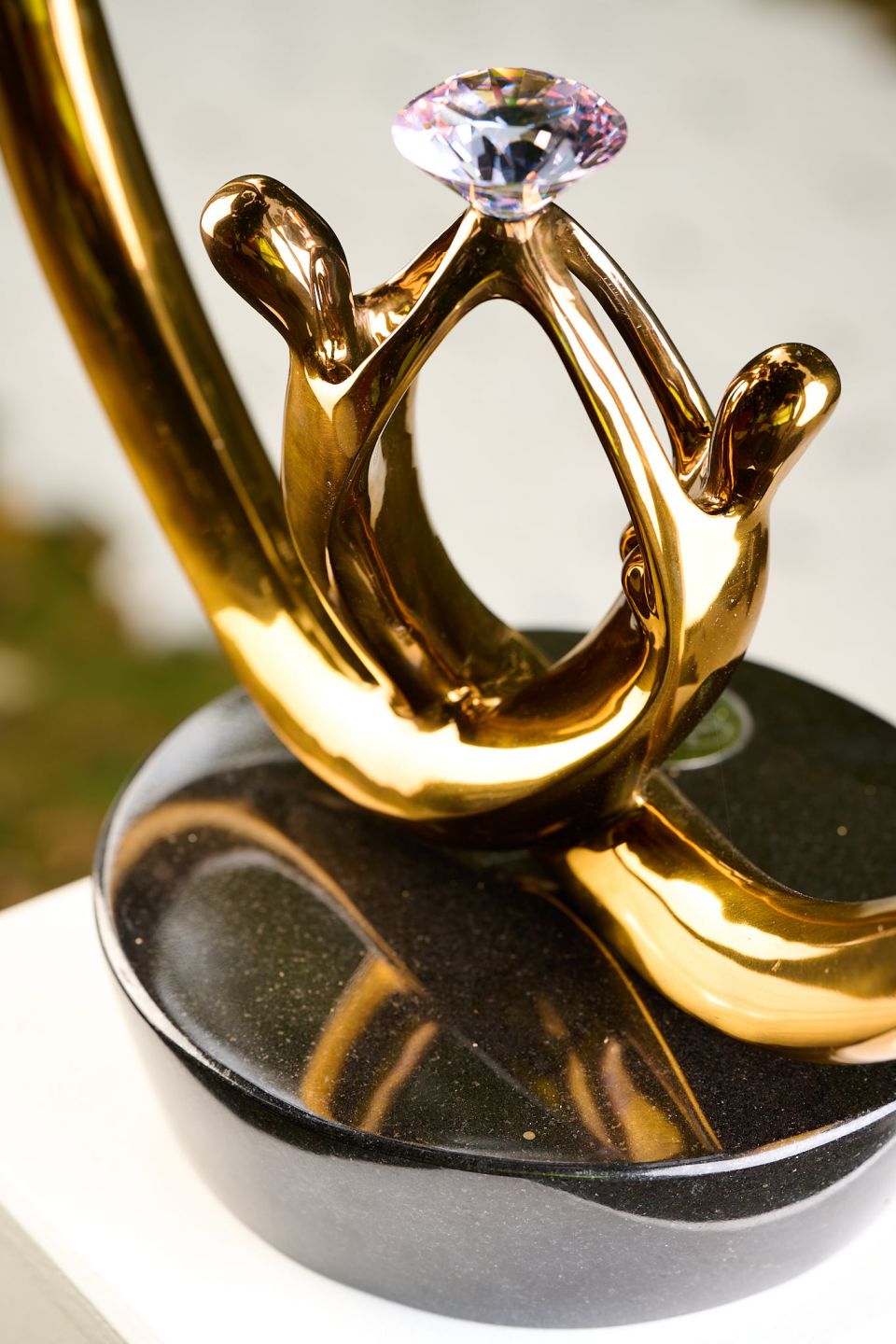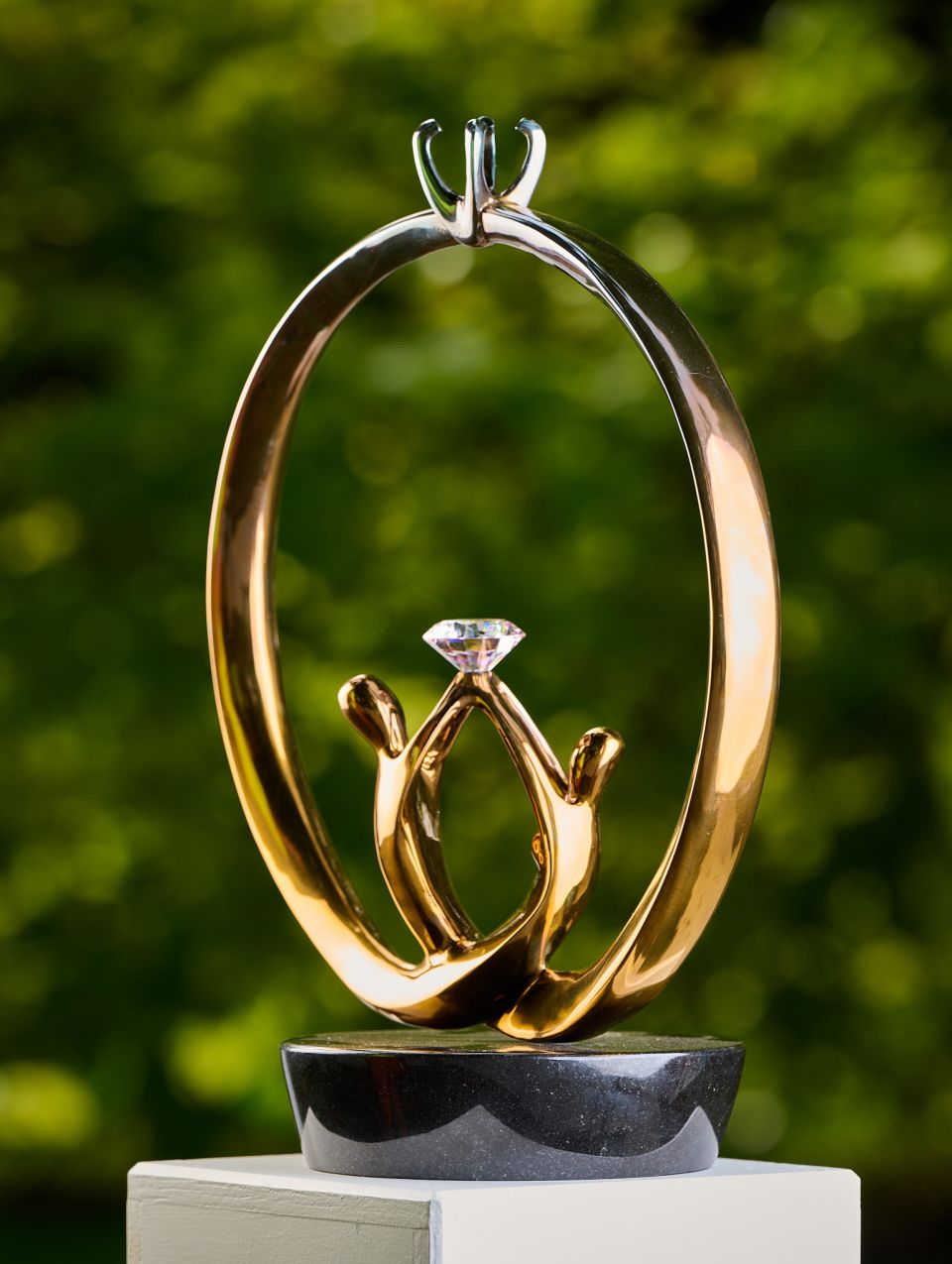 - Media: Sculpture: Silicon Bronze with special patina sealed in clear coat. Base: Black polished granite. Gemstone: Round cut cubic zirconia
