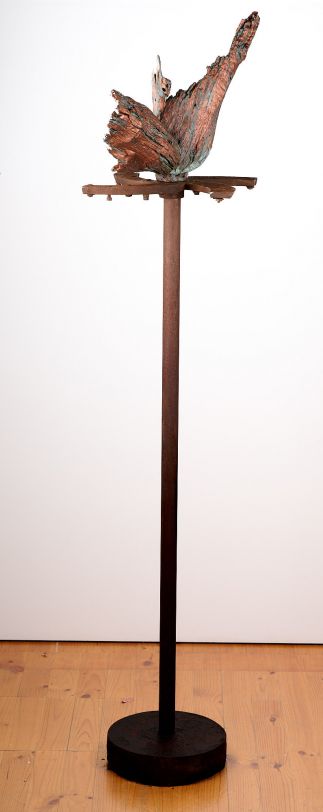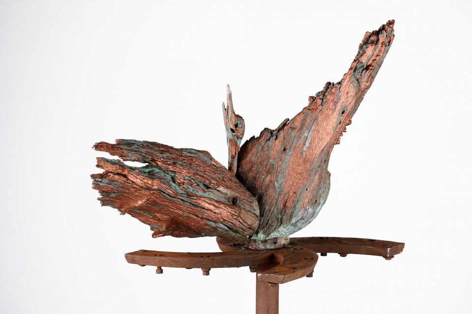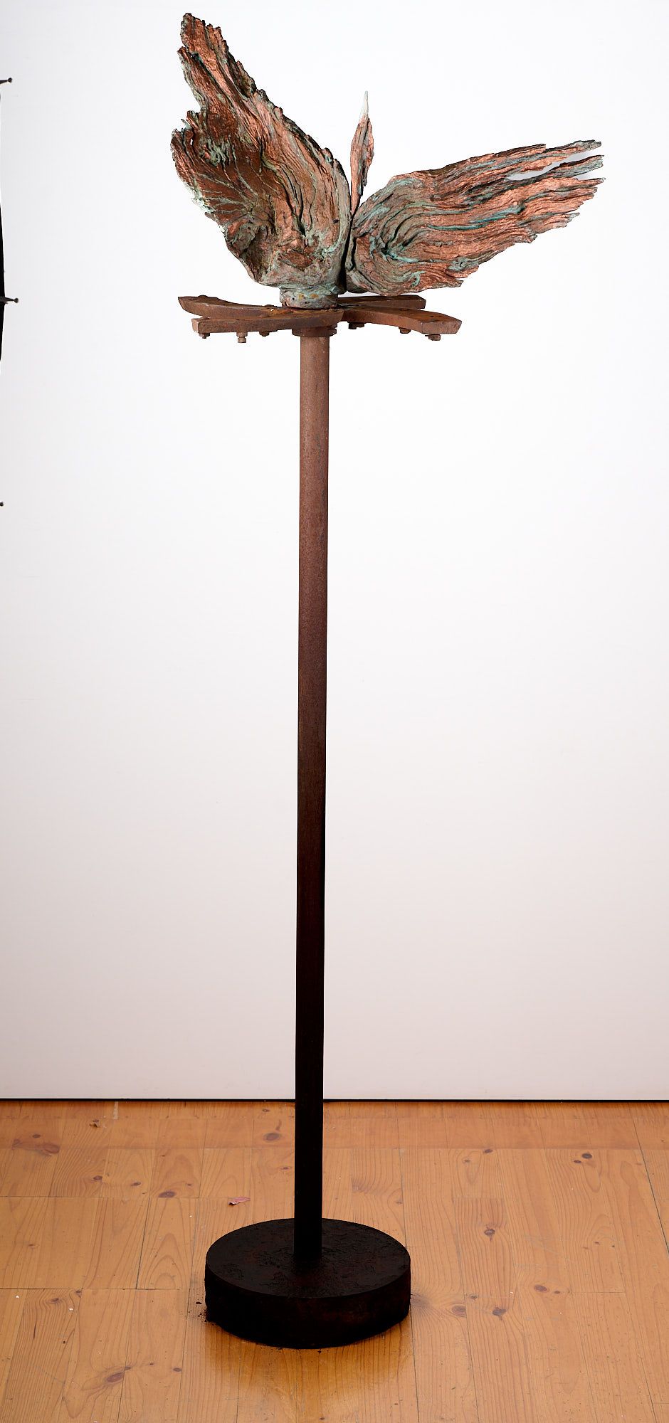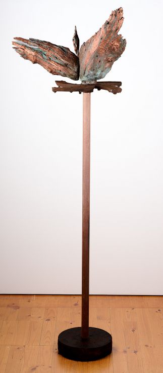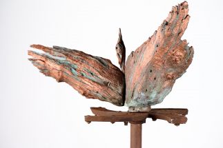 From the chrysalis exhibits symbolic wings taking flight from the top of a sacred totemic structure, expressing a form of rebirth.