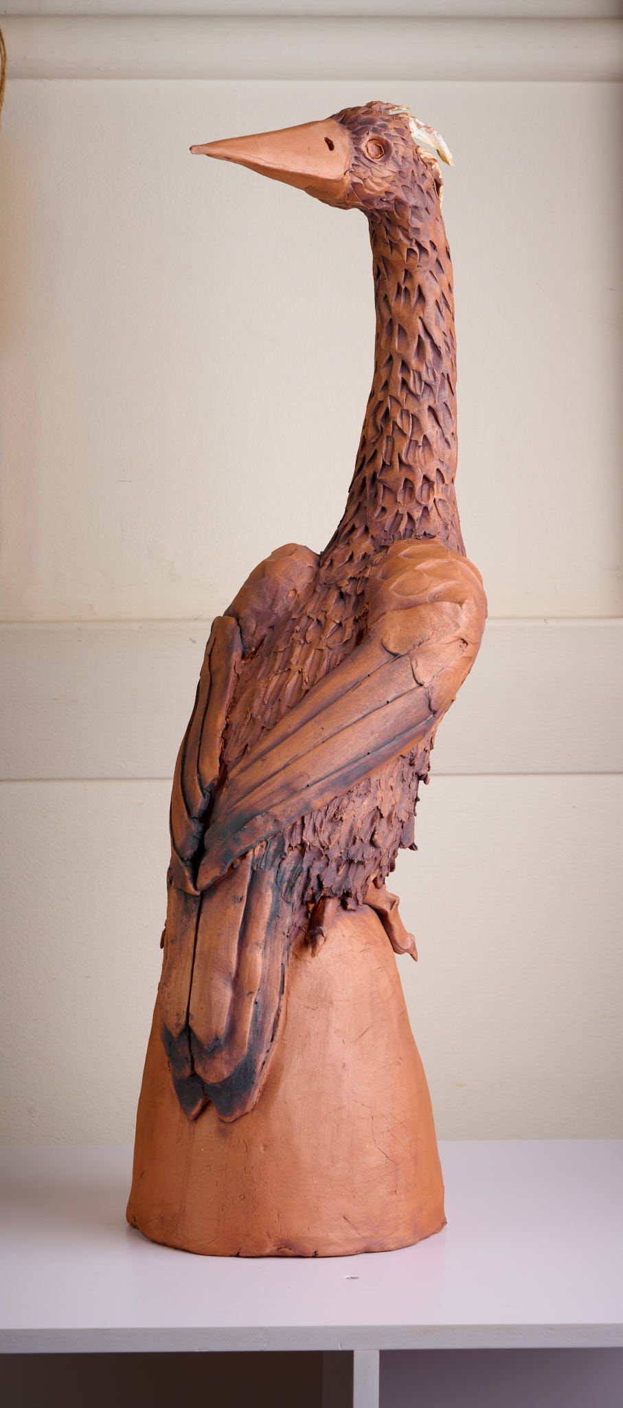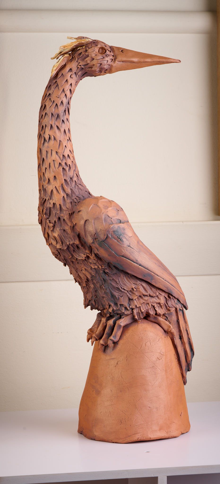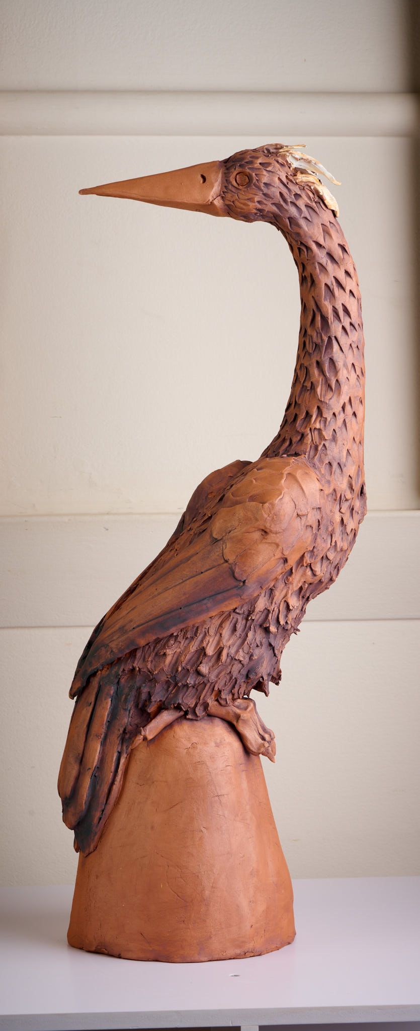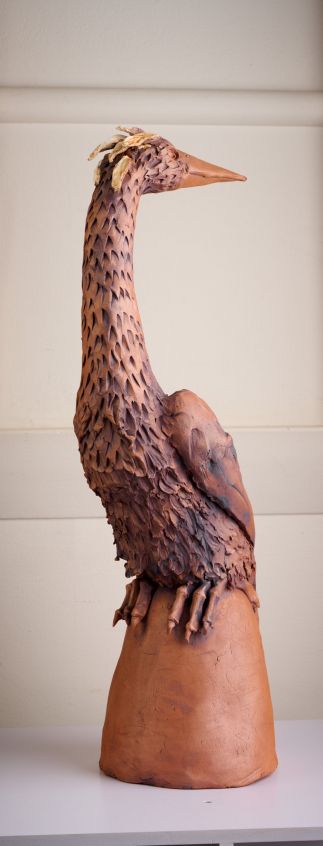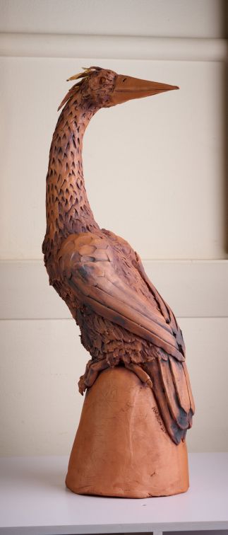 This piece is based on a Heron as I love the elegance of their necks and am often inspired by the birds I see in our garden. It is made from a terracotta clay and finished with underglaze and oxides.