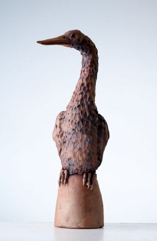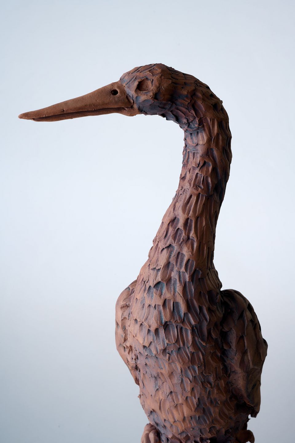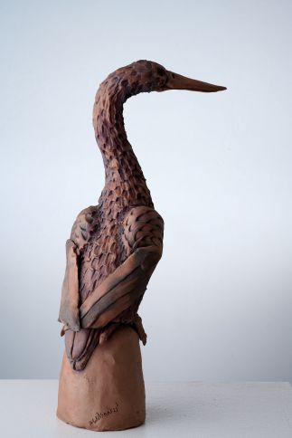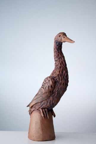 This piece is based on a water bird made from terracotta clay and finished with oxides, It can be placed outside or inside.